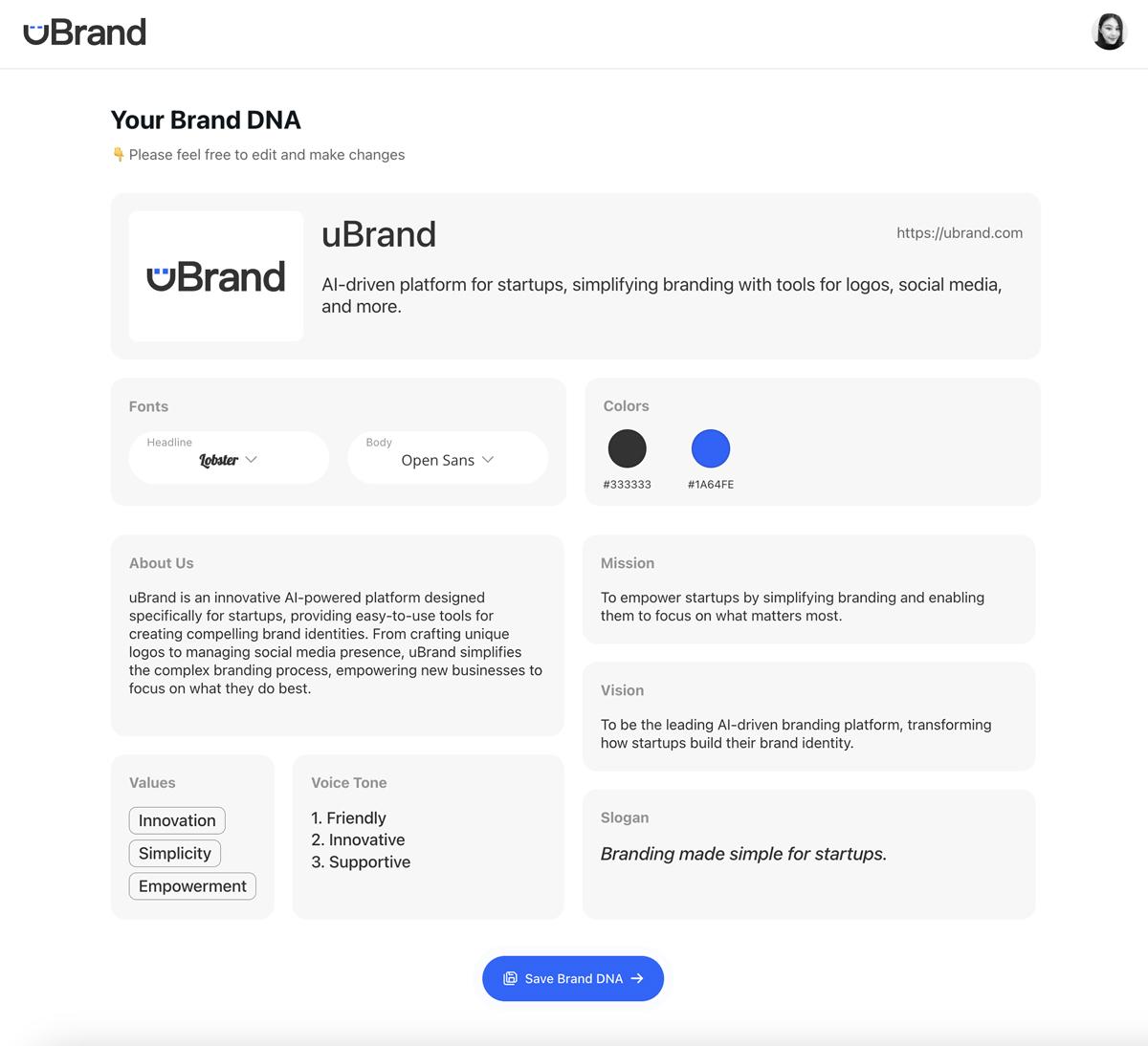 uBrand is an AI brand-building platform designed to help you create viral-ready brand content by generating a complete Brand DNA.