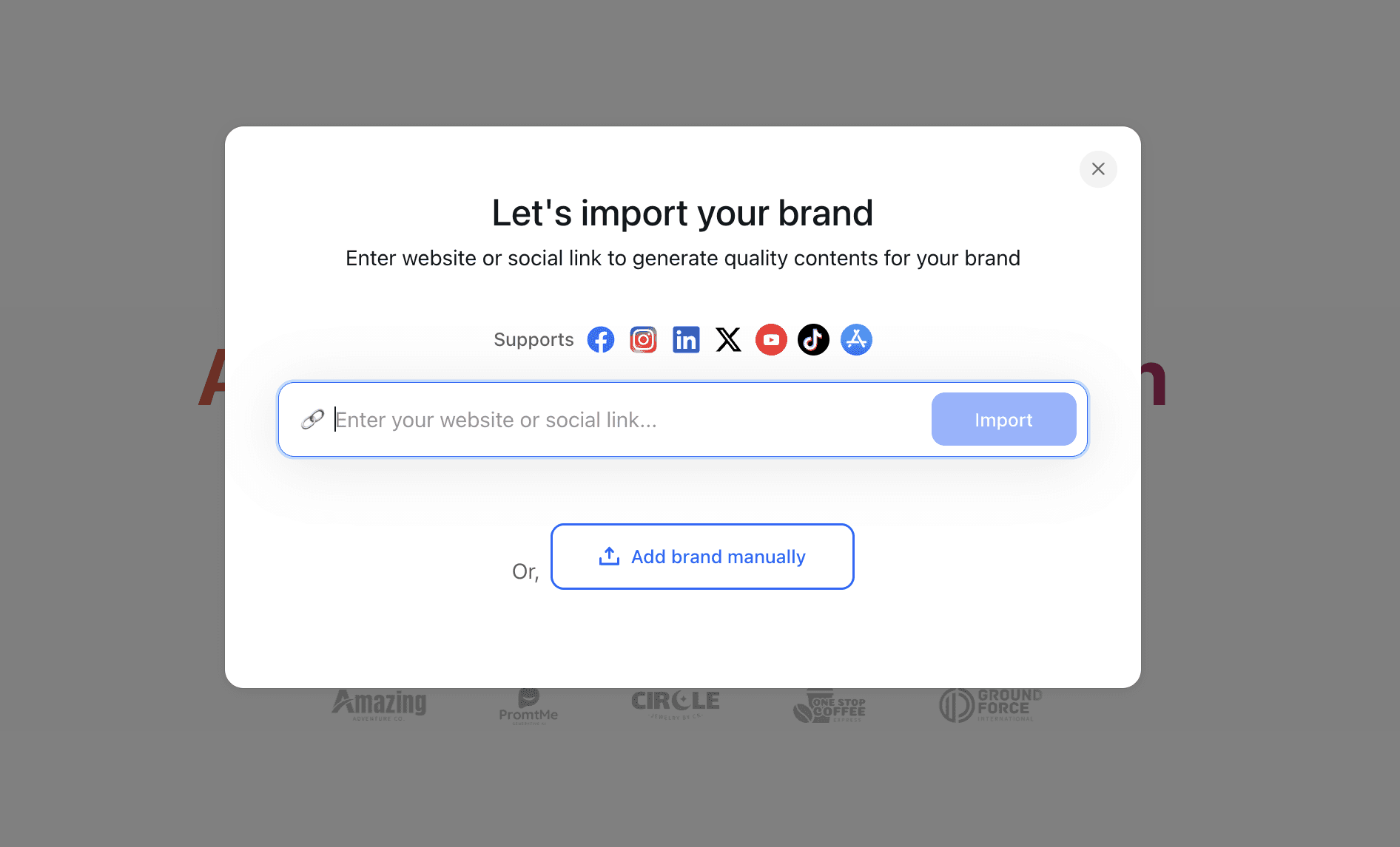 You simply enter your website URL, or a social media link. From there, the AI analyzes your brand presence and generates a full Brand DNA profile. You can also upload your logo, name, and description to add your brand manually.