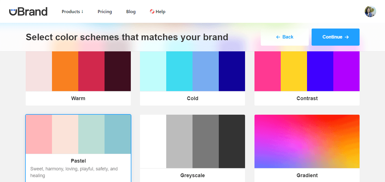 Next, choose a color palette that perfectly describes your brand. Click on, CONTINUE.