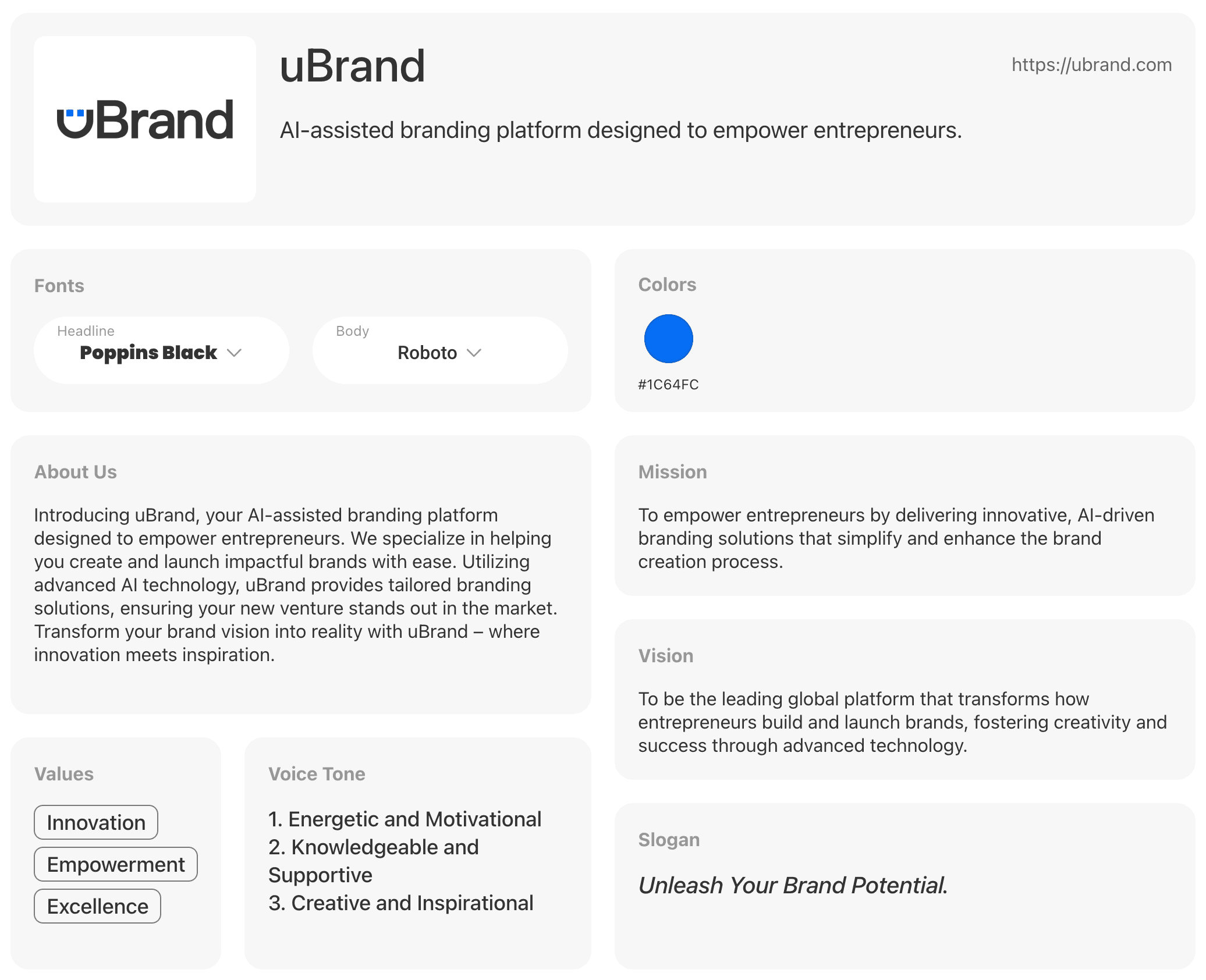 Today, you do not need a massive budget to establish a professional identity. When you use uBrand, the platform actually generates your Brand DNA automatically during the initial setup process. By simply answering a few questions about your business, industry, and target audience, the AI analyzes the data and constructs a comprehensive brand strategy for you. It defines your mission, suggests your brand voice, and outlines your core values in a matter of minutes.
