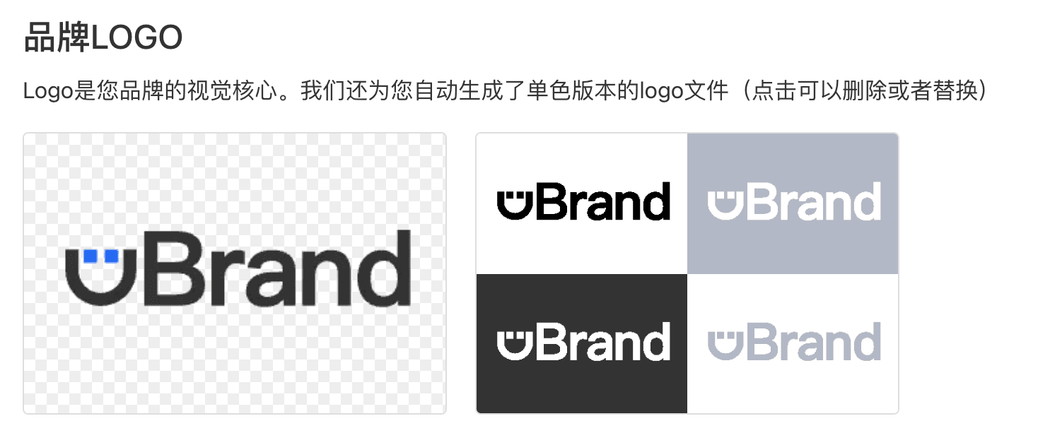 品牌经营者要做到这些,只需要借助uBrand平台功能,一键就能够生成一整套品牌相关的设计。除此之外,uBrand还为您自动生成了单色版本的logo文件,让你省时省力建立品牌。