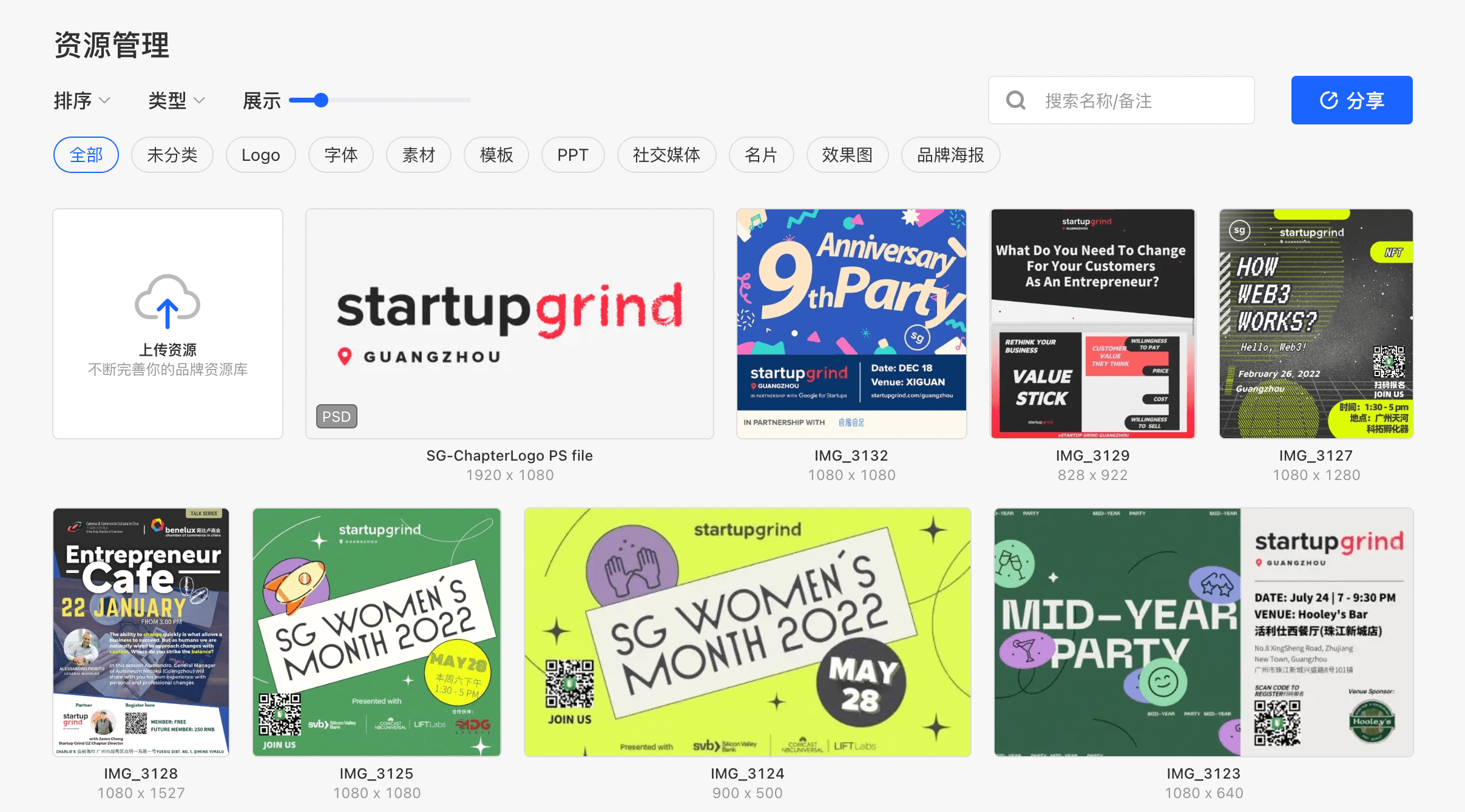 如果你想要构建一个品牌资源管理系统,这个过程也没有你想象中那么复杂。uBrand不仅仅提供创建品牌手册的功能,同时也提供品牌资源管理系统功能,你可以按照logo、字体、PPT、社交媒体、海报等类别来上传你的品牌资源,从而逐渐完善你的品牌资源库。