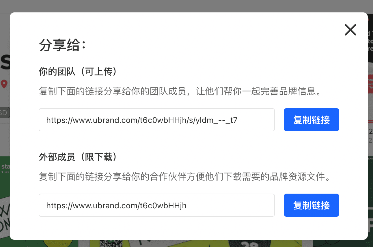 除此之外,还能够通过分享按钮,分别分享给团队内部成员,让他们共同完善品牌信息,以及分享给外部人员,让你的合作伙伴非常方便地下载他们需要的品牌资源文件。