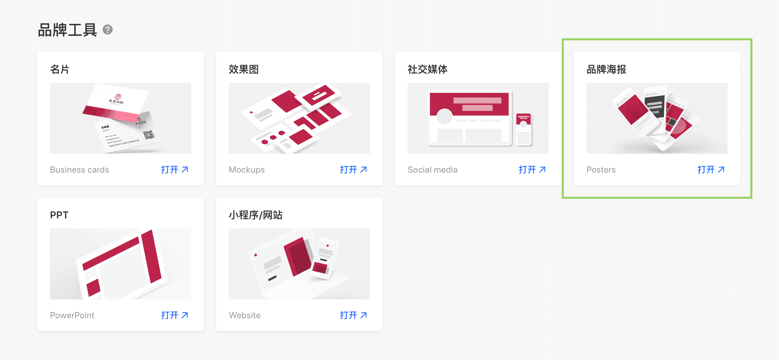 上传你的品牌logo后,在后台找到「品牌海报」工具。uBrand在素材库里,提供了100+不同主题的海报排版,除了常用的招聘,广告宣传类海报,我们还会根据时下热点和营销日历实时更新,提供全新好看的设计方案给大家使用。