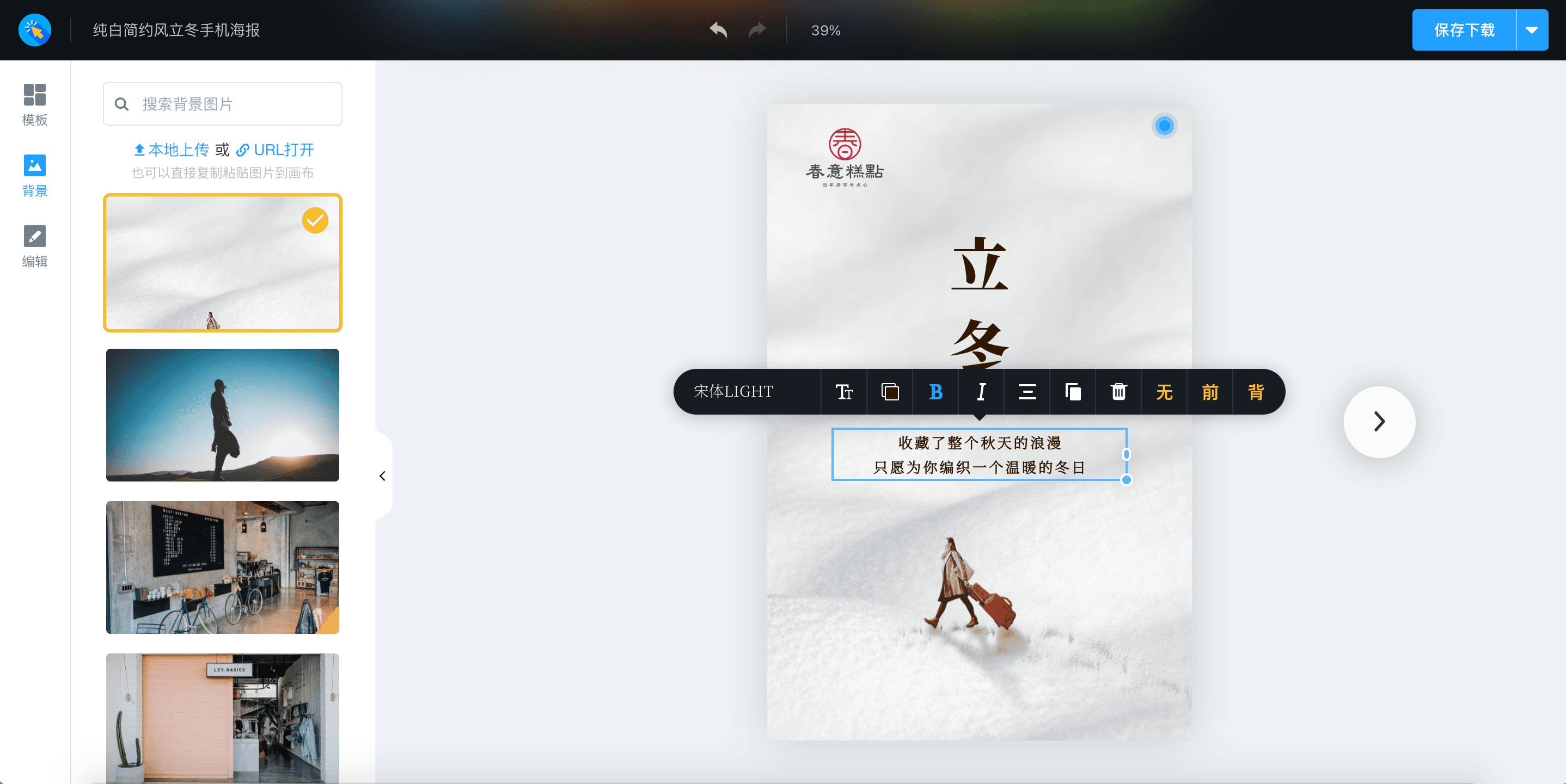选择主题进入编辑面板,品牌logo会被智能导入,你可以通过简单的点选、伸缩、编辑文字,或本地上传最能代表品牌形象的图片素材,海报就完成了。(tips:选择一句能代表此时语境的文案,能快速拉近品牌与目标用户的距离。)