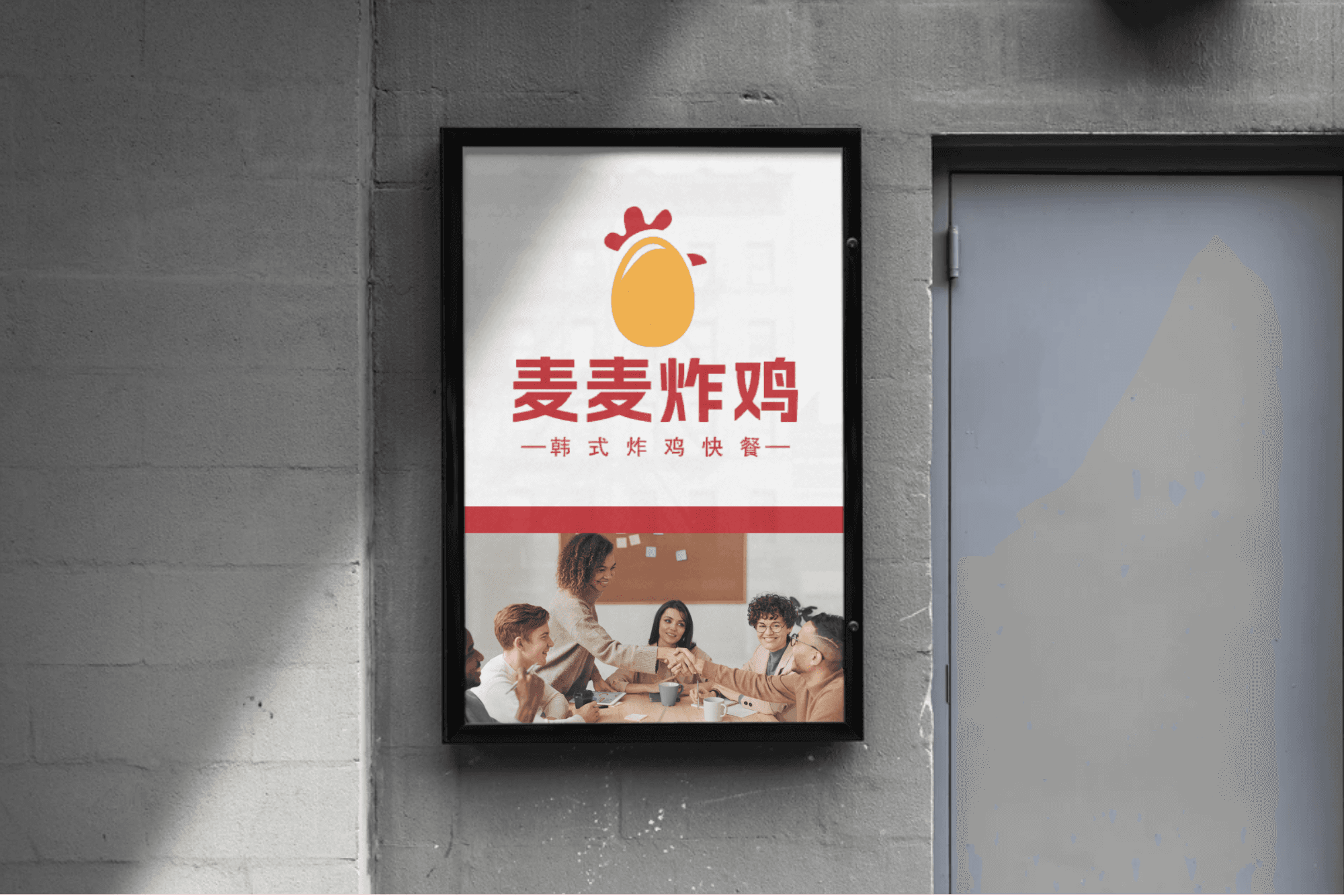 这个炸鸡店Logo设计具有鲜明的视觉特点,上方的图案是一只鸡蛋,顶部有简化的鸡冠设计,使用了暖黄色和红色的配色,象征着新鲜和美味。下方的文字“麦麦炸鸡”采用了粗体红色字体,突出品牌名称,易于识别,文字下方的小字“韩式炸鸡快餐”简洁明了,明确了餐厅的特色和定位,整体设计简洁、现代,传递出活泼、亲切的品牌形象,适合吸引年轻消费者和家庭顾客。