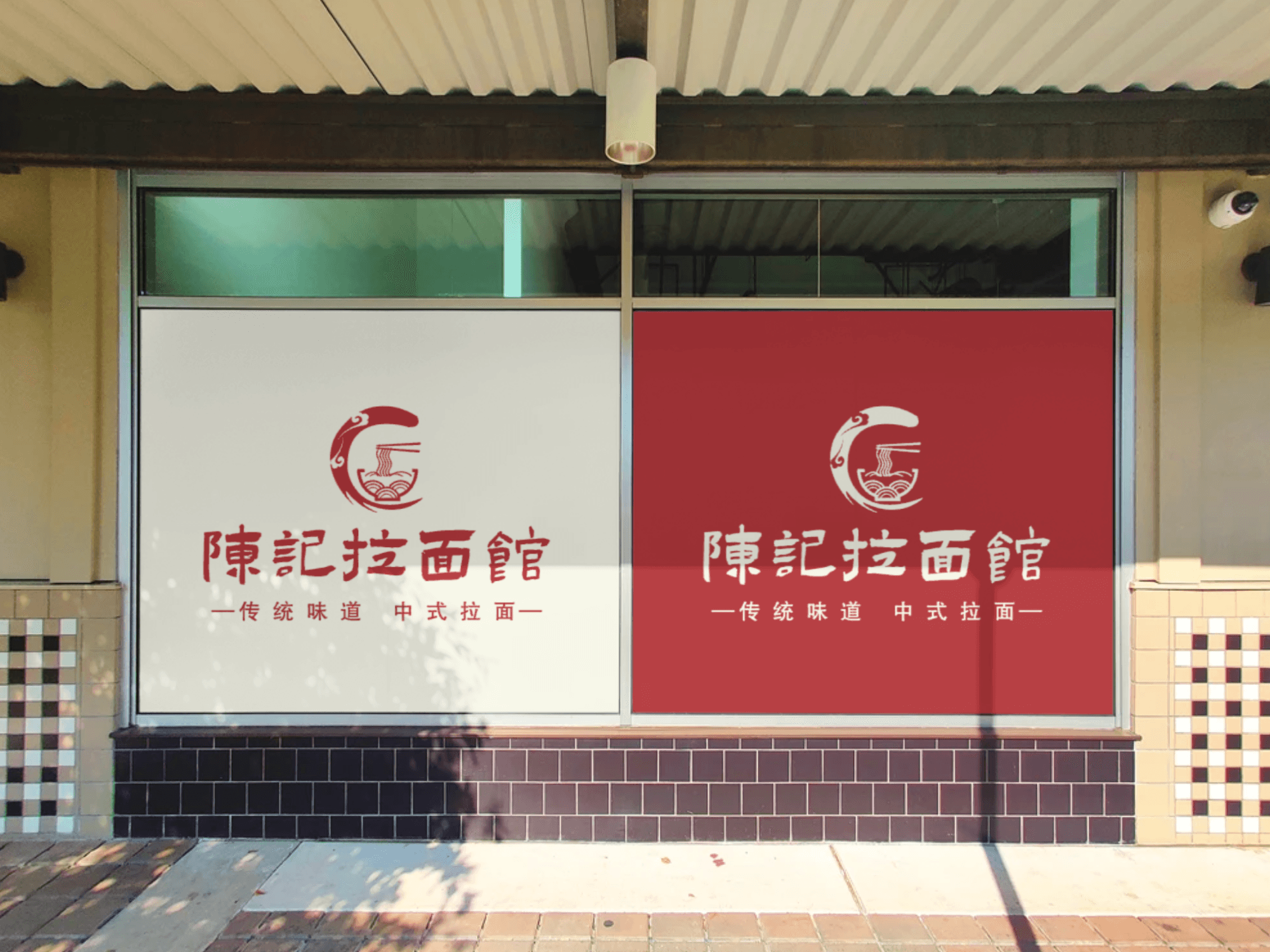 这个中式传统面馆Logo设计突出了文化传承和美食特色,Logo上方是一个红色的圆形图案,内部包含了一碗热气腾腾的拉面,象征着传统美味,圆形图案的设计元素简洁,具有中国传统风格,下方的店名“陈记拉面馆”采用了手写风格的字体,传递出手工制作的质朴与真实感,底部的口号“传统味道 中式拉面”简洁明了,明确了餐厅的特色和定位,整体设计简洁大方。