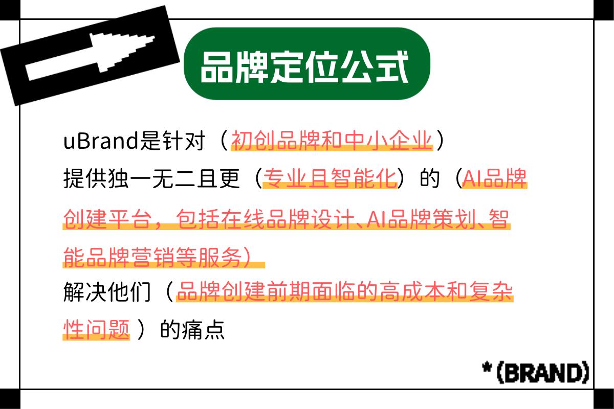 用uBrand举个例子,uBrand作为一个面向初创企业和中小企业的品牌创建平台,其品牌定位可以这样表述:针对初创品牌和中小企业的,提供独一无二且更加智能化的AI品牌创建平台,包括在线品牌设计、AI品牌策划、智能品牌营销等服务,解决他们在品牌创建前期面临的高成本和复杂性问题。